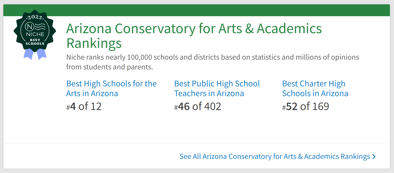 A+ School of Excellence Award – Giải thưởng Trường học Xuất sắc A+: Arizona Conservatory for the Arts Academy đã được Tổ chức Giáo dục Arizona chỉ định là Trường học Xuất sắc A+. Giải thưởng này công nhận các trường đã thể hiện sự xuất sắc trong học thuật, khả năng lãnh đạo và sự tham gia của cộng đồng.