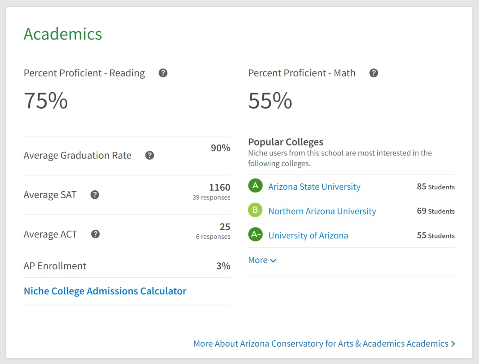 Nhạc viện Nghệ thuật và Học thuật – Arizona Arizona Conservatory for Arts and Academics cung cấp nhiều khóa học về nghệ thuật và giáo dục toàn diện cho học sinh từ mẫu giáo đến lớp 12. Các khóa học được cung cấp tại Arizona Arizona Conservatory for Arts and Academics bao gồm: