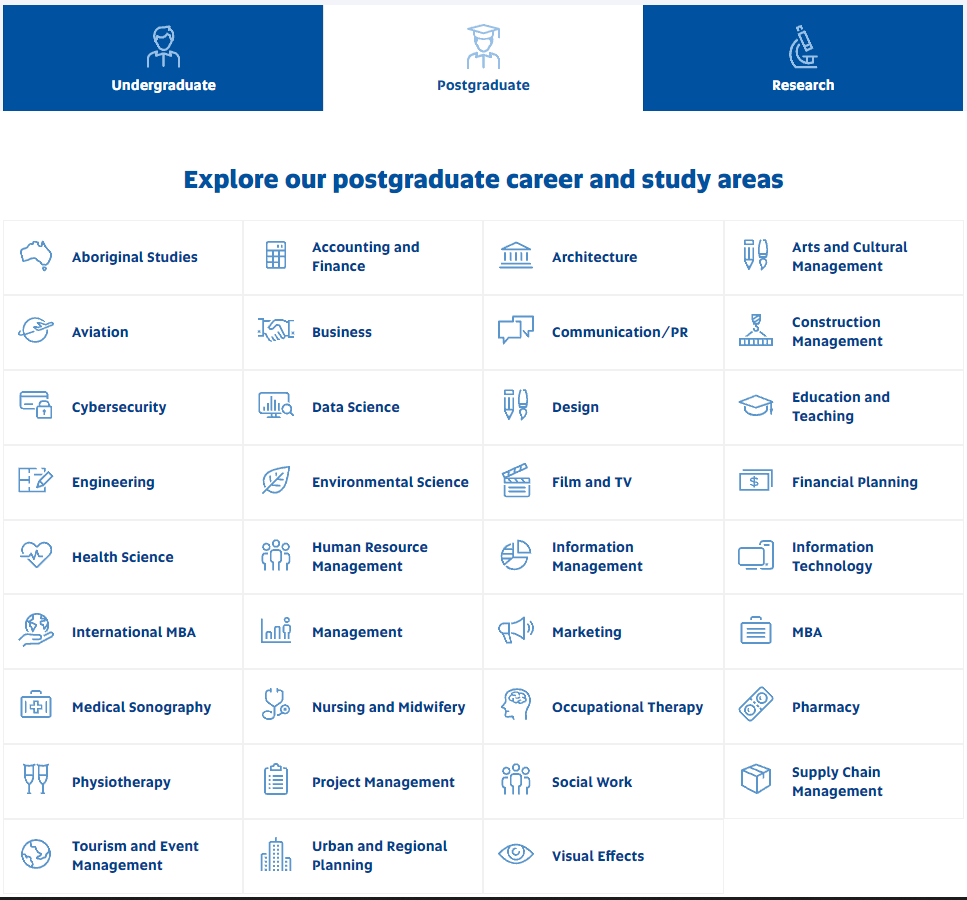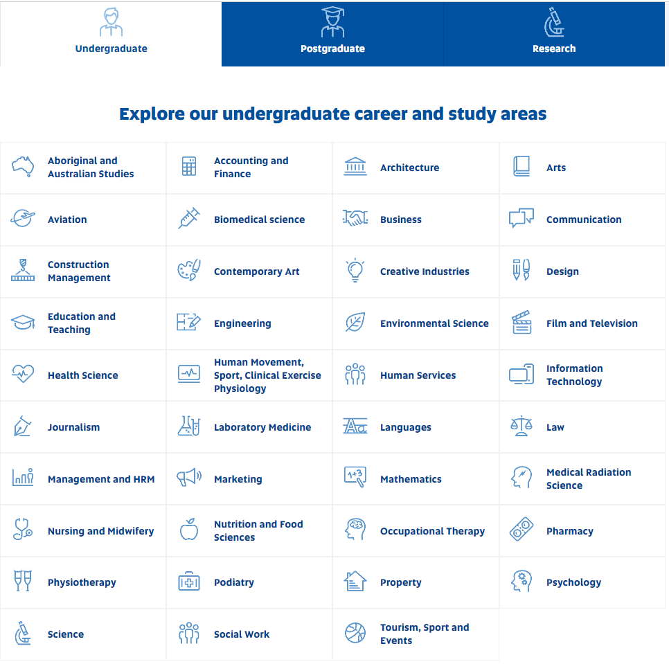Dưới đây là các chuyên ngành được đào tạo tại đại học Nam Úc: