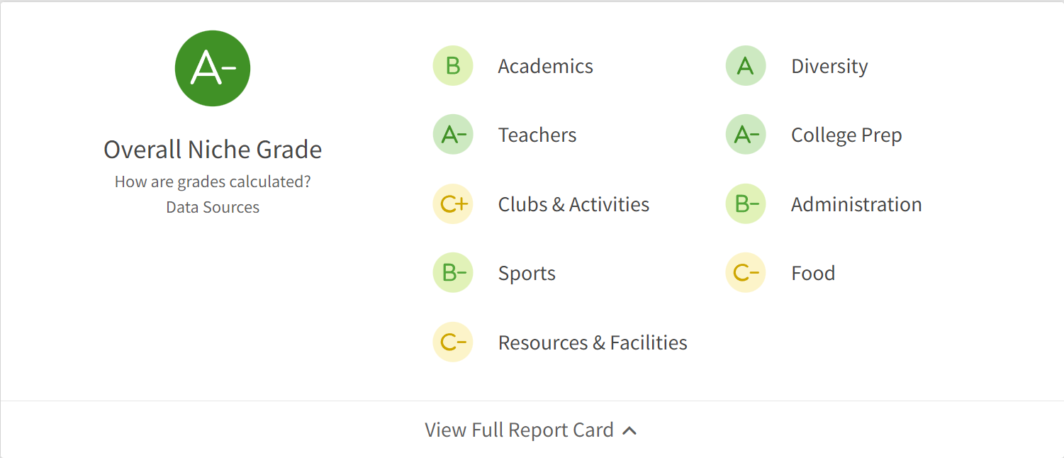 Xếp hạng A trên Niche.com (Niche.com là website cung cấp những thông tin chi tiết, nhận xét, phản hồi, đánh giá của các học sinh sinh viên tại các trường trung học và đại học trên toàn nước Mỹ)