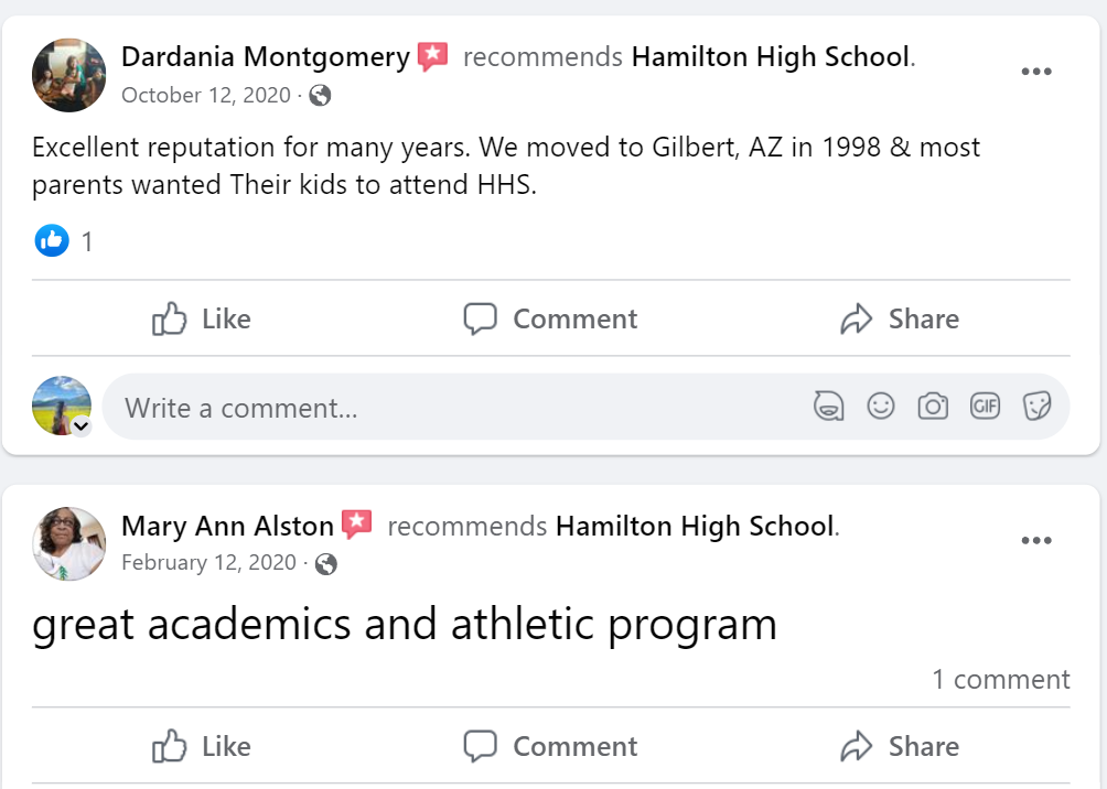 Trường trung học Hamilton High School được tạp chí Newsweek đánh giá là một trong những trường trung học hàng đầu nước Mỹ. Ngoài ra, trường còn đạt giải thưởng Siemens trở thành trường trung học đào tạo môn nâng cao (AP) Toán và Khoa học tốt nhất bang Arizona.