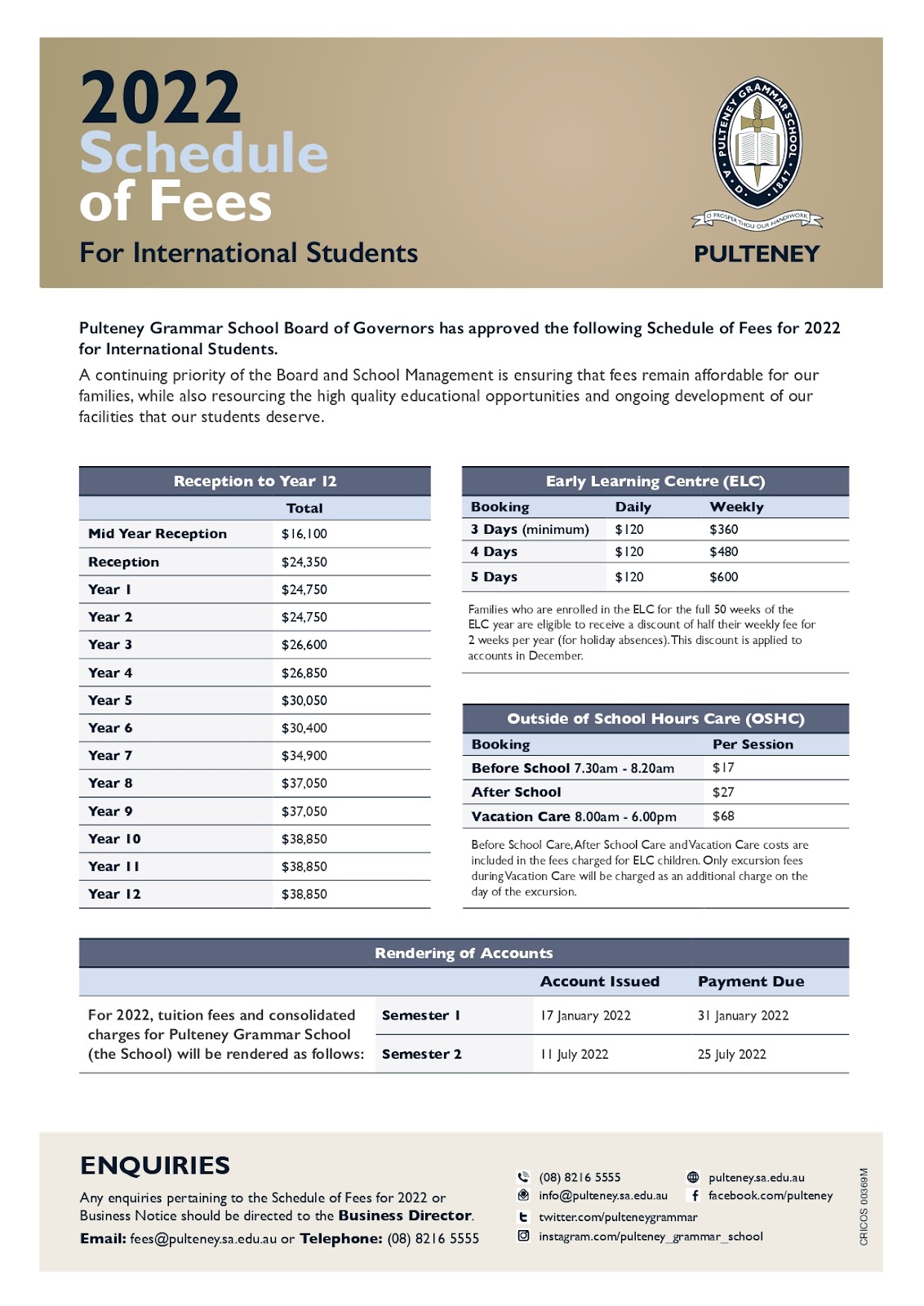 Cụ thể chi tiết mức học phí Pulteney Grammar School được thể hiện rõ qua bảng bên dưới đây