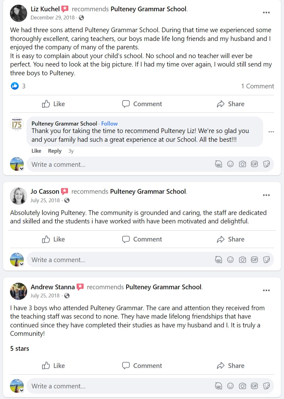 Trường trung học Pulteney Grammar School tự hào về lịch sử và truyền thống giảng dạy, cung cấp đa dạng các chương trình để học sinh có thể phát triển một cách toàn diện, năng động và sáng tạo. Phương pháp đào tạo lấy học sinh làm trọng tâm, đề cao mong muốn và sở thích, đồng thời hướng các em đến môi trường toàn cầu hóa trong phát triển thế giới ngày nay.