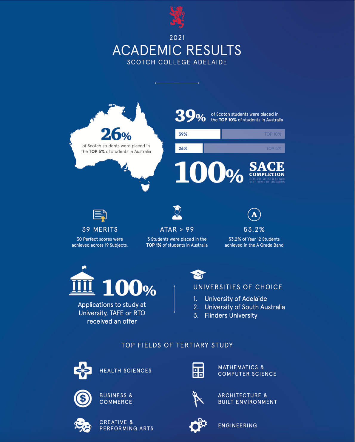 Học sinh tốt nghiệp Scotch College có kết quả xuất sắc toàn tiểu bang và nước Úc. Kết quả SACE đã thể hiện được sự nỗ lực học tập và rèn luyện của các em trong suốt những năm tháng qua. Trường Scotch College, Nam Úc vô cùng tự hào về kết quả học tập của các em trong năm học 2021 vừa qua, với: