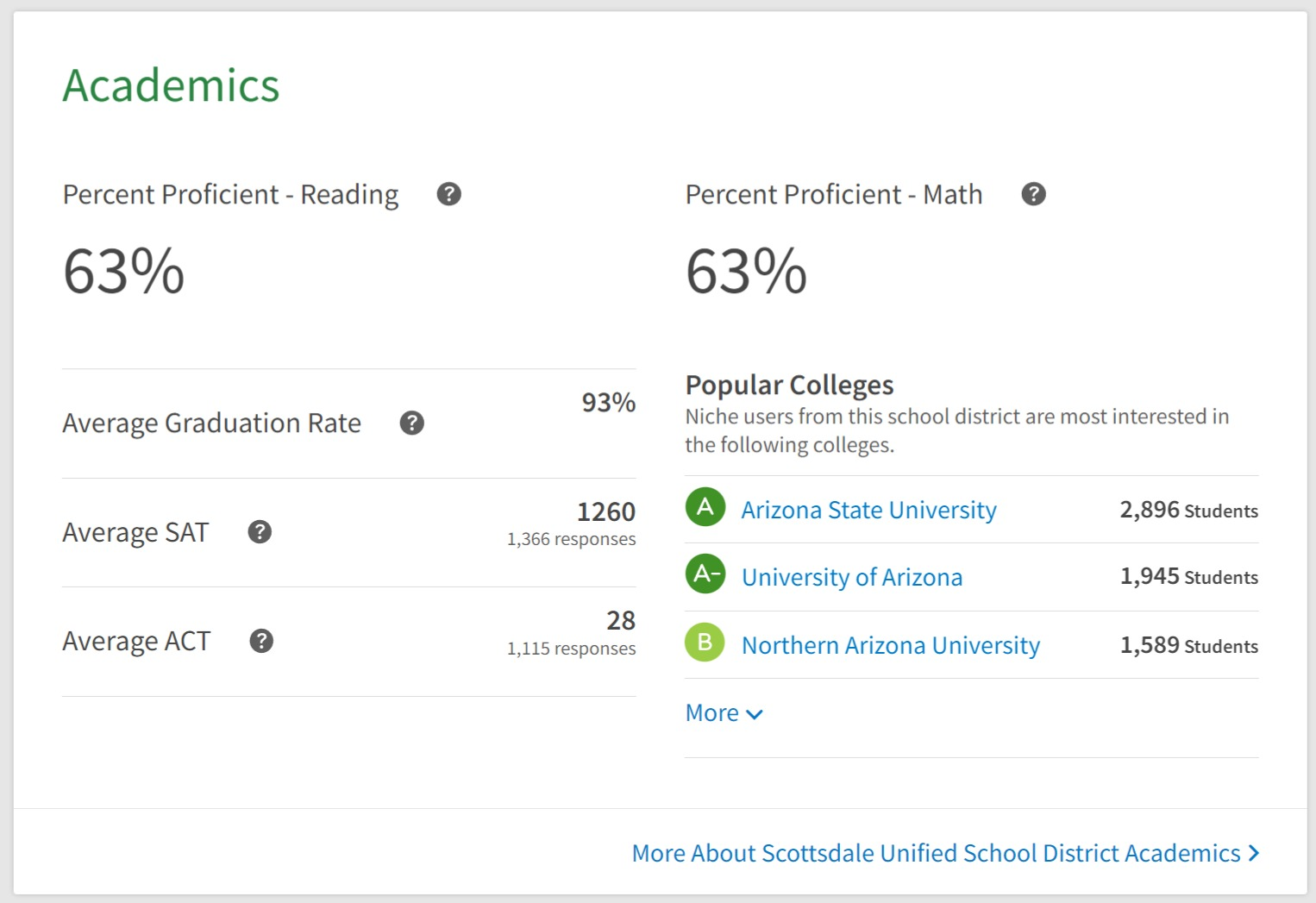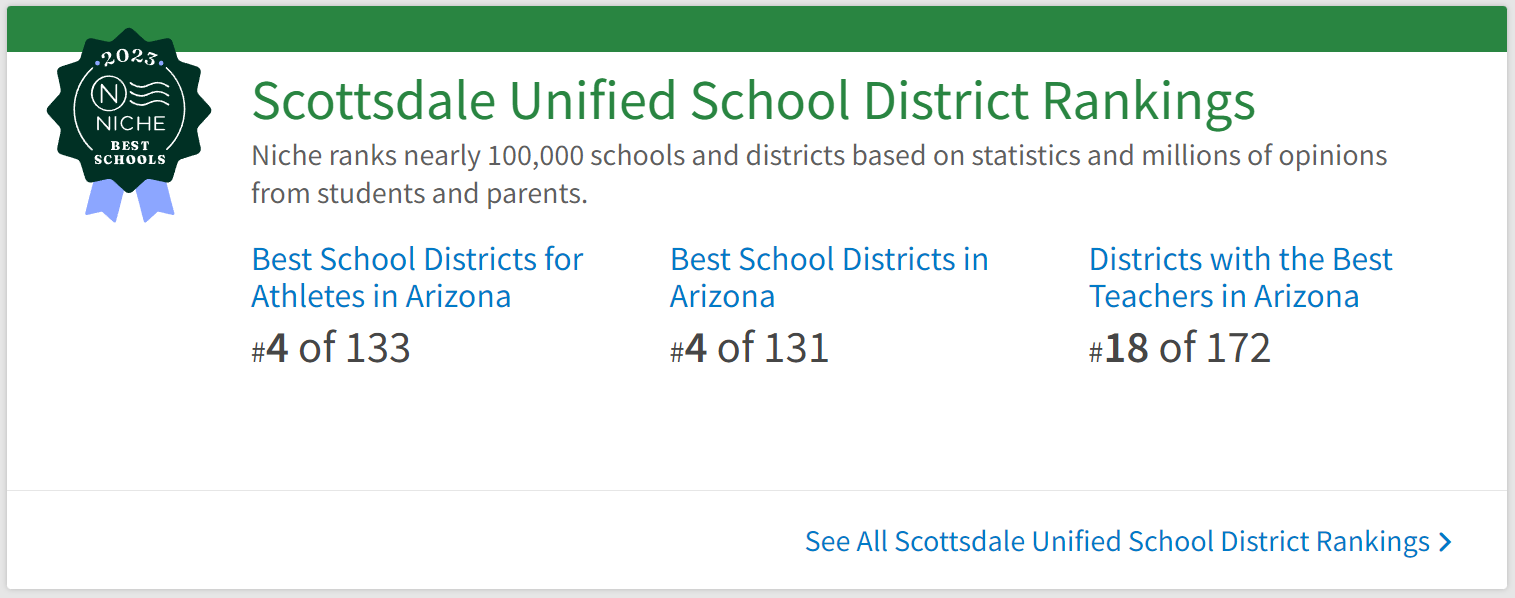 National Blue Ribbon Schools (Trường Ruy Băng Xanh Quốc Gia): Năm trường trong SUSD đã được Bộ Giáo Dục Hoa Kỳ chỉ định là Trường Ruy Băng Xanh Quốc Gia. Những trường này là trường trung học Arcadia, trường trung học Chaparral, trường trung học Cocopah, trường tiểu học Desert Canyon và trường tiểu học Kiva.